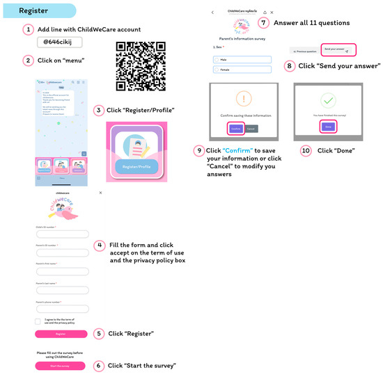 Parents are asked to add their official Line IDs to register their account for ChildWeCare. They also fill in their personal information, phone number, their child’s information, and a short demographic survey on the registration page (Figure 3).