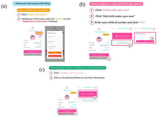 The personal information interface. (a) modify information interface (b) register a new child interface and (c) access their child’s information interface.
