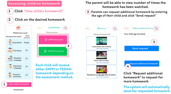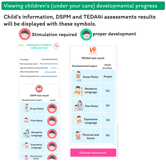 The interface to access the child’s information is presented in Figure 5, in which the child’s details, DSPM or TEDA4I assessment results, and developmental ages for each domain are shown. The assessment results and the developmental stimulation assignments will be automatically assigned to the caregivers of the children within one or two days of receiving the assessment results. The parent can access the child’s homework assignments depending on the assessment methods and results, view the length of each homework assignment, and request additional ones if desired (Figure 6).