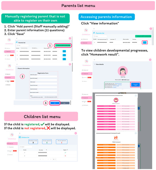 The hospital staff can view the registered information of parents and children, including the status of the registration, personal information, developmental progress, and homework assignment results. They can also manually register parents who could not register by themselves (Figure 9).