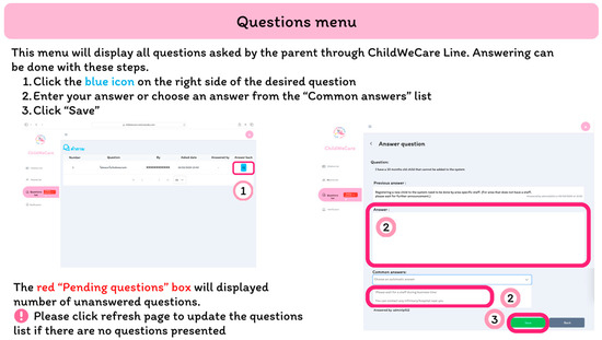 The user support interface displays a list of questions from the parents. A staff member can answer the question or set as “pending” unanswered questions that need to be answered by other staff members via this interface (Figure 10).