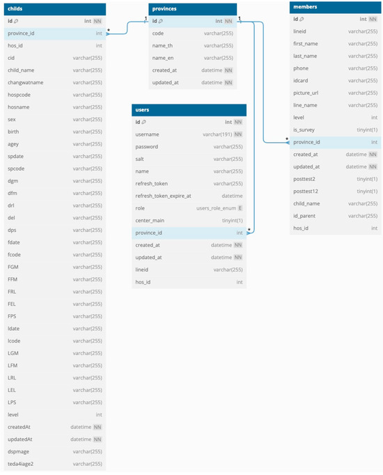 This innovative system was developed to integrate databases, telehealth services, and technology. The ChildWeCare system is linked to the Thai national database, Thai child development, and the proposed monitoring system via the Line app. The development team designed the system platform, system interfaces, and record form for the system using the Vscode program for system development and design. The database was developed using the Structured Query Language (SQL), which is the main programming language for managing data stored in databases. While SQL was initially used only with relational database management systems, its use has been significantly extended with the advent of new types of database systems. Specifically, SQL is a powerful query language for highly distributed and scalable systems that process big data (i.e., datasets with high volume, velocity, and variety). It can be divided into two main categories. First, the Data Definition Language (DDL) is used to manage tables and index structures. The most basic items of DDL are the CREATE, ALTER, RENAME, and DROP statements. Second, the Data Manipulation Language (DML) is a subset of SQL used to add, update, and delete data in tables [30,31].