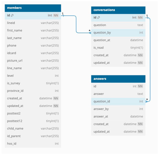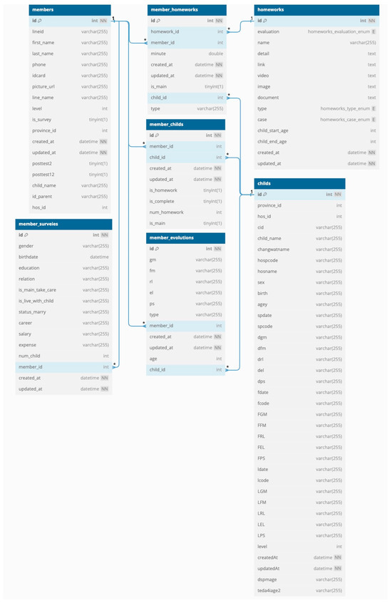 The database was developed using MySQL, which can store data in various table formats and handle large volumes of data. The database can store information about the child, parent, outstanding and completed homework assignments, and usage. It comprises 11 tables, including children (child information and DSPM and TEDA4I results), members (parent information), users (hospital staff), provinces (province name), conversations (questions from parents), answers (answers from staff to the questions from parents), homework assignments (details such as the name and age of the child, the type of homework, DSPM or TEDA4I assessment information, and video links), member_surveys (survey answers from the parents when registering on ChildWeCare), member_homework (the relationship schema for homework assignments and members), member_child (the relationship schema for children and members), and member_evolution (the relationship schema for evolution and members) (Figure 12, Figure 13 and Figure 14).