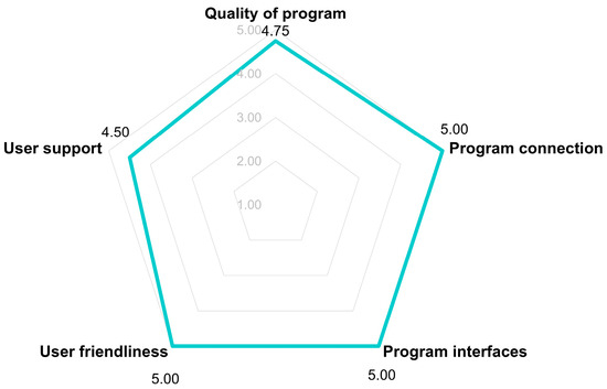 All of the parents frequently accessed the ChildWeCare system after returning home (average: 3–4 times per week). After participating in the pilot testing of the system for 8 weeks, the parents were contacted and asked about their satisfaction with using the system, including the quality of the program, program interfaces, program features, user-friendliness, and user support. Each domain was evaluated using a Likert scale from 1 (very dissatisfied) to 5 (very satisfied). The results (four of seven parents responded) show that the satisfaction with each item was high on average (Figure 15).
