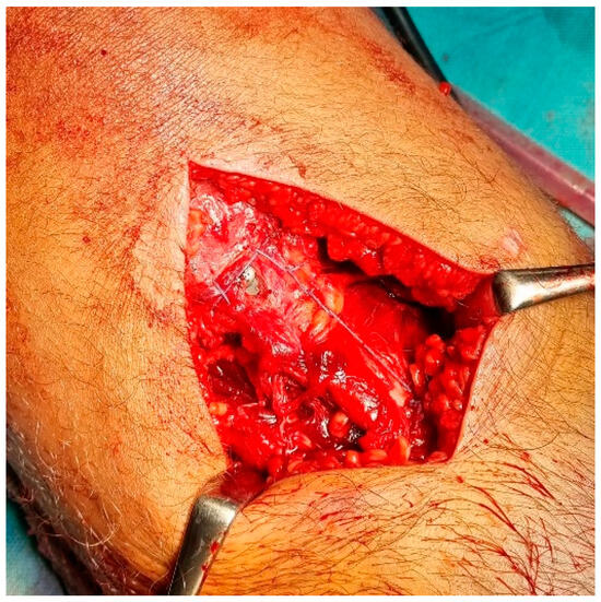All patients had the same surgical treatment, an open reduction and internal fixation (ORIF) of the tibial apophysis with two or three cannulated screws (depending on the size and stability of the avulsed apophyseal fragment), followed by a primary tendon repair with a transosseous suture technique Krakow-like with Fiberwire (Figure 1, Figure 2, Figure 3, Figure 4 and Figure 5).