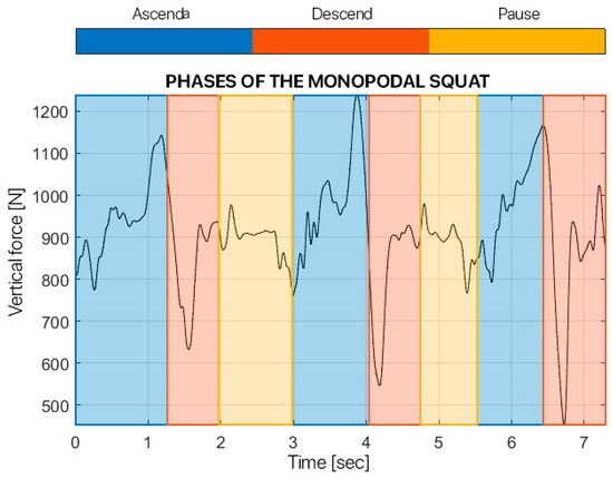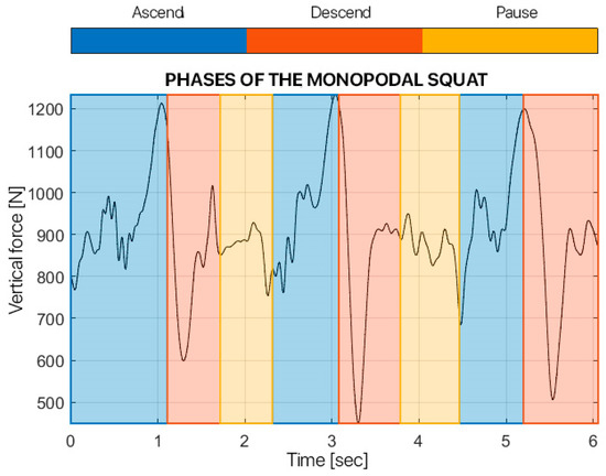 For the analysis of the single squat, the three components of the force that the subject exchanged with the ground were filtered with a 4th-order low-pass Butterworth filter with a cut-off frequency of 15 Hz. The signal was segmented into the three phases that composed the task, so each phase comprised a single squat. For each squat, the maximum force exchanged with the ground was calculated and the average force between the three squats was calculated.
