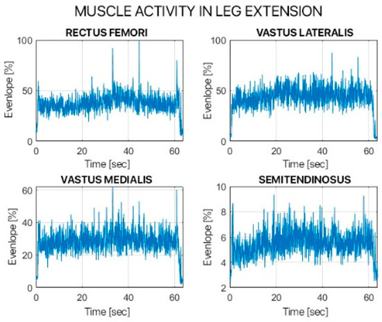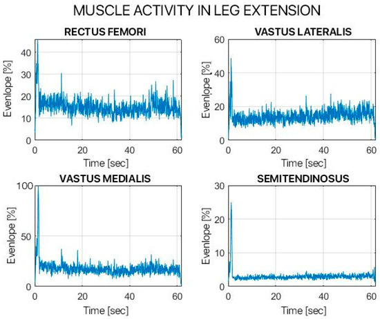 To collect the surface electromyographic signal (sEMG), the patients were equipped with four wearable probes for the (BTS FREEEMG 1000, BTS S.p.A., Milan, Italy), with a sampling rate of 1000 Hz. The probes were positioned on the target muscle (rectus femoris, vastus lateralis, vastus medialis, semitendinosus), chosen from the literature, according to the SENIAM recommendations. Adhesive Ag/AgCl electrodes (Kendall ECG Electrodes H124SG, Cardinal Health, Dublin, OH, USA) with an effective diameter of 10 mm and an inter-electrode distance of 20 mm (center to center) were employed to detect signals.