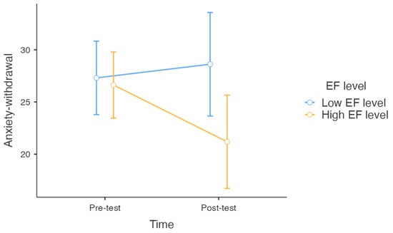 Mean anxiety–withdrawal scores at pre-test and post-test for children with different levels of executive functions (EF).