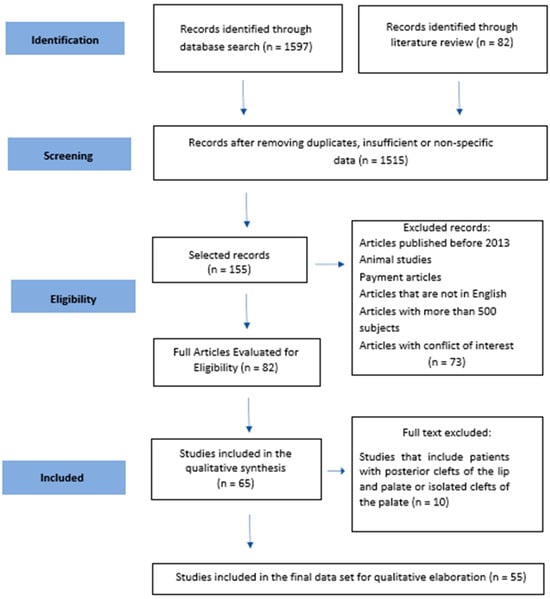 The process of identifying, selecting, and removing studies is summarized in an initial phase where 1597 studies were identified. Of this total, 82 articles were considered potentially eligible based on the title and general description.