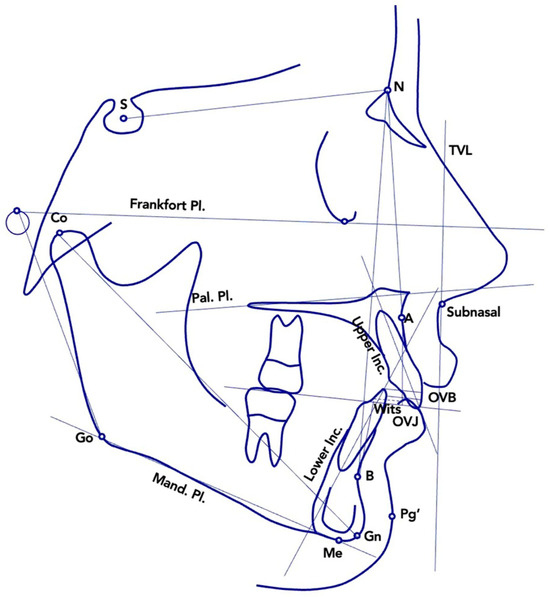 Cephalometric variables measured at T1 and at T2. Abbreviations: S—sella; N—nasion; Pal—palatal; Pl.—plane; Mand.—mandibular; Inc.—incisor; OVJ—overjet; OVB—overbite (vertical overlap); TVL—true vertical line (perpendicular to the Frankfort Plane, passing through subnasale); Go—gonion; Co—condylion; Me—menton; Gn—gnathion; Pg’—soft tissue pogonion; A—point A; B—point B.
