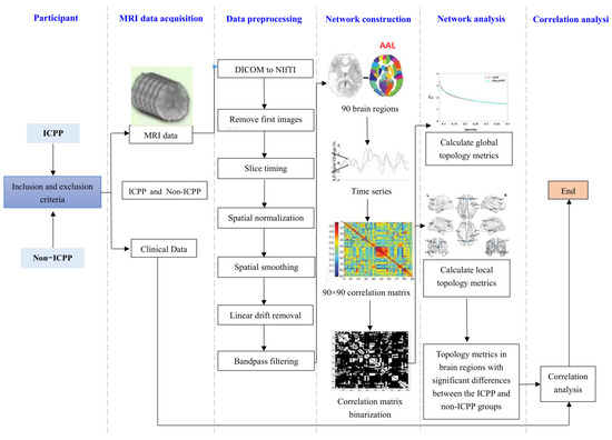 As the central organ of the endocrine system, the brain plays a key role in the pathogenesis of ICPP by regulating the secretion of sex hormones through the HPG axis. Consequently, the relationship between brain function and ICPP has become a key area of research. In routine clinical practice, patients with precocious puberty are typically evaluated using conventional cranial MRI to rule out structural abnormalities such as suprasellar arachnoid cysts and hypothalamic hamartomas [10]. In most cases of central precocious puberty (CPP), no significant abnormalities in the central nervous system are detected, and these cases are therefore classified as ICPP [10]. With the increasing application of functional MRI based on blood oxygen level-dependent (BOLD) contrast, resting-state fMRI has become a valuable method to assess intrinsic brain activity due to its advantages, including convenient data acquisition, a non-invasive approach to detecting changes in brain activity, and the availability of multiple brain activity parameters [11,12]. Recent studies have begun to explore brain functional changes in children with ICPP. Yu et al. [13] employed rs-fMRI with regional homogeneity (ReHo) analysis to explore the effects of early HPG axis activation on brain function in 41 ICPP patients and 44 controls. ReHo, as an important metric for assessing local synchronisation of brain activity, measures the similarity of BOLD signal time series among neighbouring voxels within a brain region, thereby indirectly reflecting the local synchronisation of neuronal activity [13]. ReHo provides a quantitative tool for identifying local brain functional abnormalities in ICPP. Compared to controls, the ICPP group exhibited increased ReHo in the left inferior temporal gyrus and decreased ReHo in the left superior temporal gyrus, bilateral orbitofrontal gyri, and left parieto-occipital gyrus. These findings suggest that early HPG axis activation may alter brain function in children with ICPP, potentially affecting cognitive and emotional processes. Chen et al. [14] investigated resting-state functional connectivity (RS-FC) differences between 29 ICPP patients and 38 controls, observing reduced RS-FC between the insulae and right middle frontal gyrus, as well as between the left fusiform gyrus and right amygdala. These results indicate that ICPP patients exhibit disrupted functional connectivity in specific brain regions, particularly those involved in cognitive and emotional regulation, which may affect their cognitive and emotional development. These findings indicate that early activation of the HPG axis impacts brain function, providing key insights into the brain function characteristics of ICPP girls. However, research on this topic is limited and still in its early stages, with most studies focusing on single analytical methods, such as ReHo or RS-FC [13,14], and lacking a systematic investigation of whole-brain network topology. Brain networks involve not only functional connectivity between regions but also the complex interactions between nodes and edges [15]. Therefore, it requires further in-depth analysis of multidimensional brain networks. Graph theory analysis is an effective approach for studying brain functional networks using imaging techniques, allowing for the examination of the topological properties of functional brain networks from a global perspective [15,16,17]. By conceptualizing the brain as a complex network composed of multiple functional regions (nodes) and their interconnections (edges), graph theory quantitatively evaluates the relationships between nodes, revealing both the global properties (such as small-worldness, normalised clustering coefficient, and normalised characteristic path length) and nodal properties (such as node efficiency and clustering coefficient) of the brain [16]. This method has been widely applied to the study of brain functional networks in both healthy individuals and patients [15,16,18,19,20]. However, the application of graph theory analysis to the study of ICPP brain networks remains an unexplored area in current research, warranting further investigation.