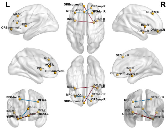 Brain regions showing differences in resting-state functional connectivity between the ICPP and non-ICPP groups. Note: The yellow dots represent brain regions, the red lines represent enhanced functional connections between the two brain regions, and the blue lines represent reduced functional connections between the two brain regions.rain regions. SFGdor.R, right dorsolateral superior frontal gyrus; ORBsup.R, right orbital superior frontal gyrus; MFG.L, left medial frontal gyrus; ORBsupmed.L, left medial orbital superior frontal gyrus; INS.L, left insula, INS.R, right insula; ACG.L, left anterior cingulate gyrus; AMYG.R, right amygdala.