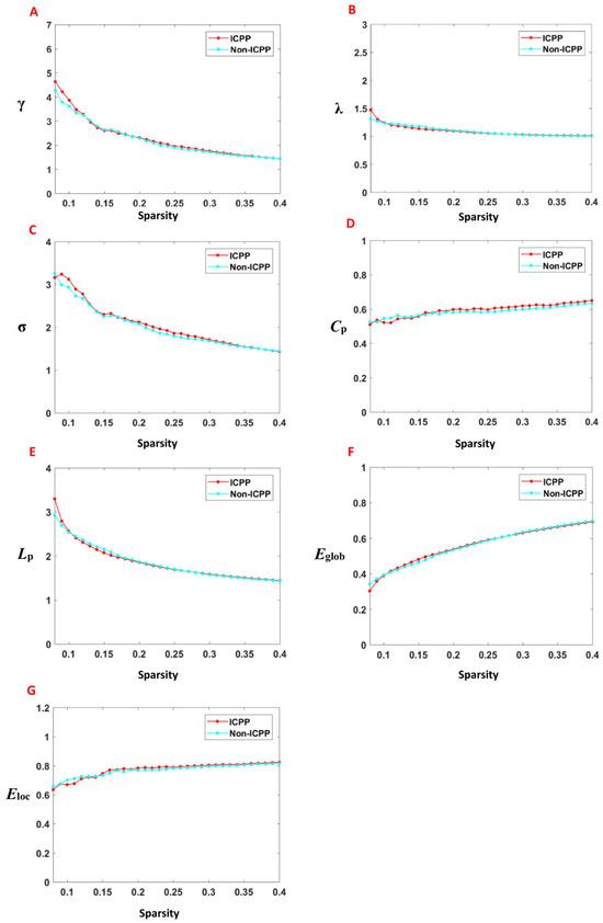 Within the predefined network sparsity thresholds (0.08–0.40), the functional brain networks in both groups demonstrated typical small-world properties, characterised by γ > 1, λ ≈ 1, and σ > 1. Across this range, no statistically significant differences were observed in the AUC for key network metrics, including clustering coefficient (Cp), characteristic path length (Lp), normalised clustering coefficient (γ), normalised characteristic path length (λ), small-world index (σ), global efficiency (Eglob), and local efficiency (Eloc), between the ICPP and non-ICPP groups (p > 0.05) (Figure 3, Table 2).