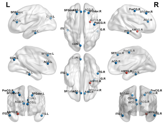 Brain regions with statistically significant differences in nodal clustering coefficients between the ICPP and non-ICPP groups. Note: Red dots represent brain regions with increased clustering coefficients, and blue dots represent brain regions with decreased clustering coefficients. SFGdor.L, left dorsolateral superior frontal gyrus; SFGdor.R, right dorsolateral superior frontal gyrus; ACG.L, left anterior cingulate gyrus; ACG.R, right anterior cingulate gyrus; AMYG.R, right amygdala; CUN.L, left praecuneus; ITG.L, left inferior temporal gyrus; ITG.R, right inferior temporal gyrus.