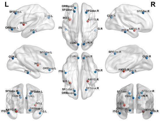 Brain regions with statistically significant differences in nodal efficiency between the ICPP and non-ICPP groups. Note: Red dots represent brain regions with increased nodal efficiency, and blue dots represent brain regions with decreased nodal efficiency. SFGdor.L, left dorsolateral superior frontal gyrus; SFGdor.R, right dorsolateral superior frontal gyrus; ORBsup.L, left orbital superior frontal gyrus; INS.L, left insula; AMYG.R, right amygdala; CUN.L, left praecuneus; CUN.R, right praecuneus; ITG.L, left inferior temporal gyrus; ITG.R, right inferior temporal gyrus.