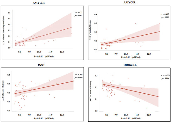 The correlation analysis revealed that the clustering coefficient and node efficiency of the right amygdala were positively correlated with peak LH levels (r = 0.422, p = 0.002; r = 0.407, p = 0.003). Similarly, the node efficiency of the left insula also showed a positive correlation with LH peak levels (r = 0.309, p = 0.008). In contrast, the node efficiency of the left orbital superior frontal gyrus was negatively correlated with LH peak levels (r = −0.331, p = 0.006), as shown in Figure 6. Correlations between other topological properties and sex hormone levels were not statistically significant (p > 0.05).