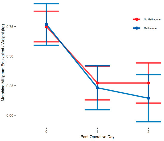 Unadjusted linear mixed model interaction plot showing MME/kg for whole sample cohort on PODs 0–2, by methadone group. Estimates showing model estimated means and confidence intervals around them. Interaction terms are included in estimates. p-values of group differences in each POD are POD 0 = 0.112, POD 1 = 0.986, POD 2 = 0.948. We observe no significant between-group differences by day.