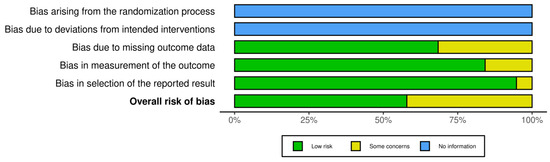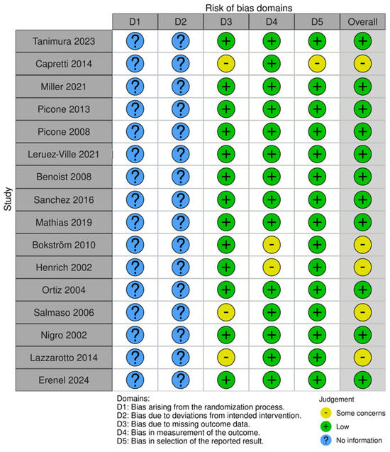 Risk bias was carried out via robvis (RobVis 2008, McGuinness, LA, Higgins, JPT. Risk-of-bias VISualization (robvis)), accessed on 14 April 2025. There was no bias arising from the randomization or the deviations of intended interventions, as there was not any randomization in our systematic review. Also, we selected studies with the same design (mostly individual case reports). The risk bias was performed by both authors. The risk was considered low if there was a detailed prenatal examination report with ultrasound and MRI report, and when the follow-up was available. Also, if there was a case of perinatal exitus, the autopsy report was available. When the ultrasound report or the MRI report was not fully available, or the follow-up was available only for the perinatal period, and in cases where the autopsy report was not fully available, and the authors only described the findings, the study was categorized as “some concerns”. Cases where the ultrasound or MRI report was completely missing, and neither a follow up nor an autopsy had been conducted, were excluded from the study. The risk bias is described in