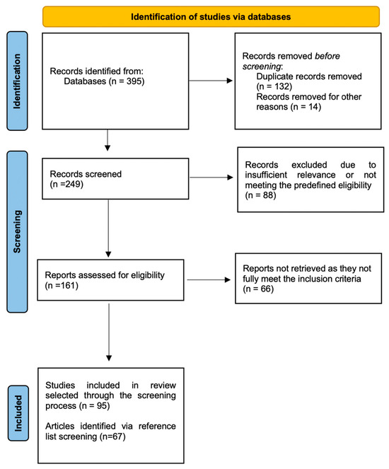 From the initial search, 395 records were retrieved. During the screening process, 146 records were excluded due to duplication, irrelevance (e.g., not original research, non-English language, not focused on humans, etc.). The remaining 249 titles and abstracts were evaluated, from which 161 full-text articles were reviewed. Of these, 95 were identified as relevant and were included for detailed analysis and discussion. A visual summary of the selection process is presented in Figure 1. Additionally, the reference lists of all articles were examined to identify relevant studies that could be included in the manuscript (n = 67), along with the references used for the introduction, general descriptive sections, and discussion (even if they were published more than 10 years ago and/or involving animal models).