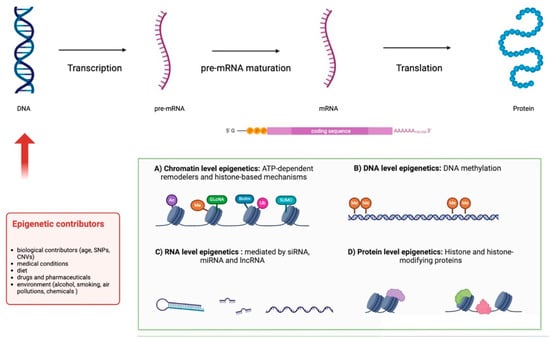 Epigenetics refers to the set of reversible and interrelated transcriptional, post-transcriptional, and post-transductional alterations that modulate gene expression and activity [65], without changing the nucleotidic sequence of DNA [64]. For this reason, epigenetics plays a fundamental role in almost all aspects of development and is implicated in the onset of different diseases [66]. The modifications can be inherited, consisting of specific gene variants in transcription factors or signaling molecules, but can also be triggered by non-hereditary contributors such as dietary habits and the environment [67]. The mechanisms involved are as follows: (I) DNA methylation: DNA methylation occurs mostly in CpG islands, normally located in the promoter region of house-keeping genes and in some tissue-specific genes and consists of the addition of a methyl group to the carbon-5 of cytosine. Usually, this mechanism is associated with gene silencing. In fact, hypermethylation of CpG islands corresponds to transcription inhibition while hypomethylation correlates with transcription activation. (II) Chromatin remodeling processes (ATP-dependent chromatin remodelers, histone protein modifications, and histone variants): Processes that induce a change in chromatin conformation, making the promoter of a gene accessible to transcription factors. ATP-dependent remodelers are chromatin remodeling complexes that exploit the energy released by ATP hydrolysis to induce structural changes in chromatin. Post-translational histone modifications are based on chemical reactions (such as acetylation and phosphorylation). Finally, histone variant substitutions refer to the incorporation of non-canonical histones into the octamer that makes up the nucleosome (the fundamental unit of chromatin, composed of a histone octamer and the DNA). All three mechanisms have the goal of weakening histone–DNA interactions, inducing the displacement of the nucleosome and, therefore, the activation of gene transcription. (III) RNA regulatory mechanisms (non-coding RNAs, miRNAs, antisense RNAs, riboswitches, and others): Long non-coding RNAs (lnRNAs) can bind regulatory proteins or transcriptional factors or interact directly with DNA/RNA molecules, influencing gene expression. Similarly, miRNAs are small RNAs derived from primary miRNAs (pri-miRNAs), larger precursors that are in turn expressed by specific non-coding genes that contain one or more miRNAs from the intronic regions of protein-coding genes. Several different miRNAs can bind a target mRNA, influencing its stability and translatability.