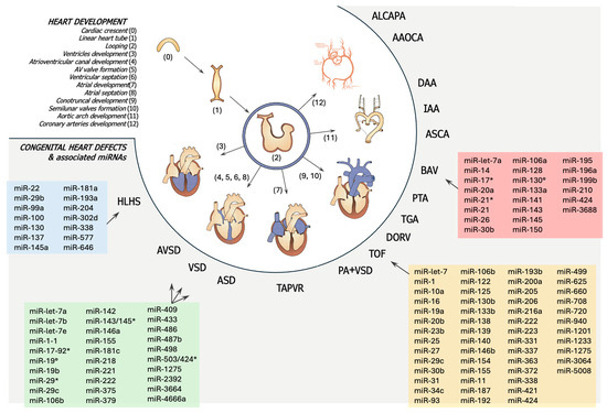 Numerous studies have demonstrated that miRNAs are required for proper heart development and function, and that distinct miRNA expression profiles can specifically and broadly affect the cell signaling pathways associated with heart defects. A summary of all key studies on miRNA expression and congenital heart disease (CHD) is provided in Table 1.