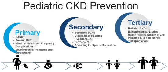 In contrast, pediatric CKD primary prevention emphasizes prenatal, neonatal, and early-life factors, including congenital anomalies of the kidney and urinary tract (CAKUT), preterm birth, maternal health, pregnancy complications, and early-life exposure to environmental pollutants and medications [3,16,17,18].