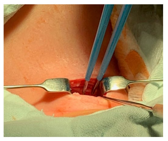 Figure 4. Bipolar cautery hemostasis. - The pretracheal longitudinal muscles are exposed, separated along the midline of the neck, and retracted laterally.