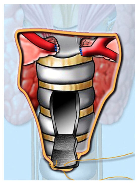 - Some authors recommend the routine placement of two sutures vertically on either side of the future tracheal incision (stay sutures) to facilitate easier and faster recannulation in case of accidental decannulation, as well as during the cannula change in the first few days after surgery (Figure 5) [3].