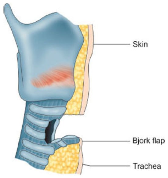 Other techniques include creating a lower tracheal flap that interrupts only one tracheal ring, which is then sutured to the lower edge of the skin incision, while the remaining skin is sutured around the edge of the trachea (Bjork flap; Figure 9 and Figure 10).
