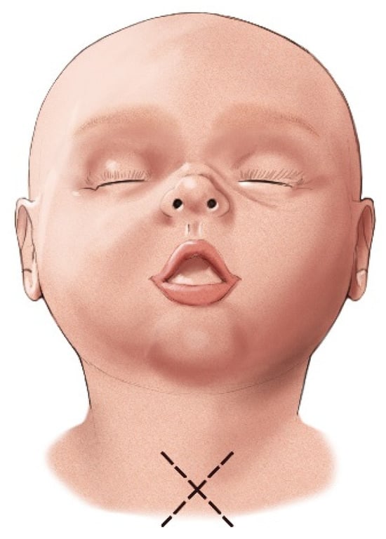 - A cruciate or X-shaped neck skin incision is made midway between the cricoid cartilage and the jugular notch of the sternum (Figure 11). In children under one year of age, each skin incision forming the X should be 1 cm long. In older children, the incision length is proportionally increased, reaching up to 2 cm in adolescents.