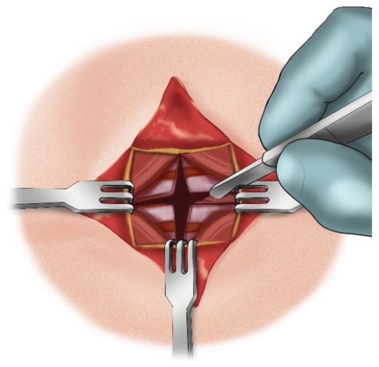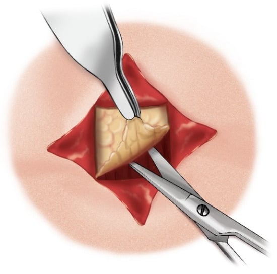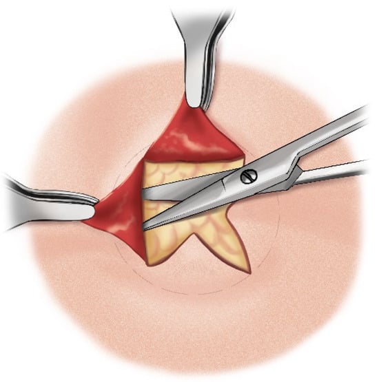 Figure 11. X-shaped skin incision. - The resulting triangular skin flaps are dissected from the underlying tissues using a dissecting scissors (Figure 12).