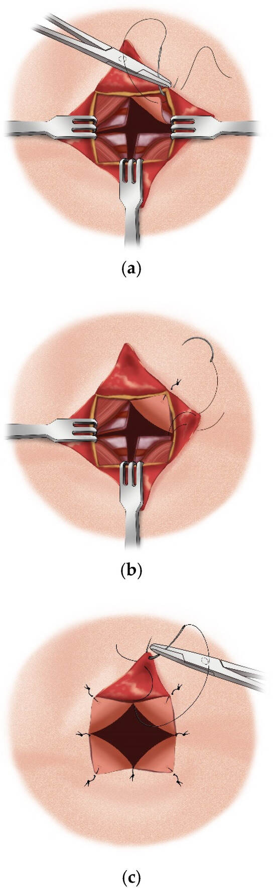 Figure 15. (a–c) Suturing of the tracheal and skin flaps.