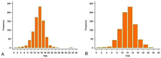 Distribution of the bilirubin levels. (A) Distribution of the total serum bilirubin (TSB, mg/dL). (B) Distribution of the forehead transcutaneous bilirubin (TCB) readings.