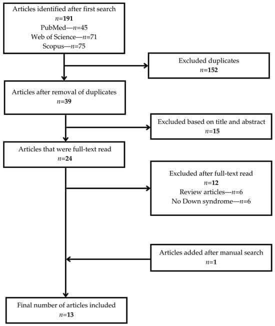 The initial search retrieved 191 articles from PubMed (n = 45), Web of Science (n = 71), and Scopus (n = 75). After removing 152 duplicate records, 39 articles remained. Following the screening of titles and abstracts, 15 articles were excluded. A total of 24 articles were assessed for full-text eligibility. Of these, 12 articles were excluded: 6 were review articles and 6 did not address DS. One additional article was identified through a manual search. Ultimately, 13 articles were included in this narrative review. The study selection process is illustrated in Figure 1, presented in a PRISMA-style flowchart. The 13 studies included in this narrative review are as follows: