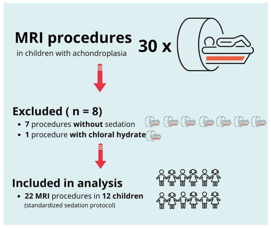 Flow diagram of patient and procedure selection. From an initial total of 30 MRI procedures in children with achondroplasia, 8 were excluded (7 without sedation and 1 with chloral hydrate). The final analysis included 22 MRI procedures in 12 children, all performed under a standardized sedation protocol.
