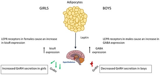 The hormones secreted from adipose tissue have a sexually dimorphic impact on the HPG axis. Adipokines, particularly leptin and adiponectin, have been found to interact with the HPG axis by crossing the blood–brain barrier (BBB) [40]. They are both secreted from adipose tissue and play a crucial role in maintaining energy balance. Additionally, they have different mechanisms by which they exert effects on the HPG axis in opposing aspects. In obesity, there is an increased amount of adipose tissue because there is an increased level of adipokines [41]. There is a positive association between the early onset of puberty and increased body weight, mostly in girls [42,43].