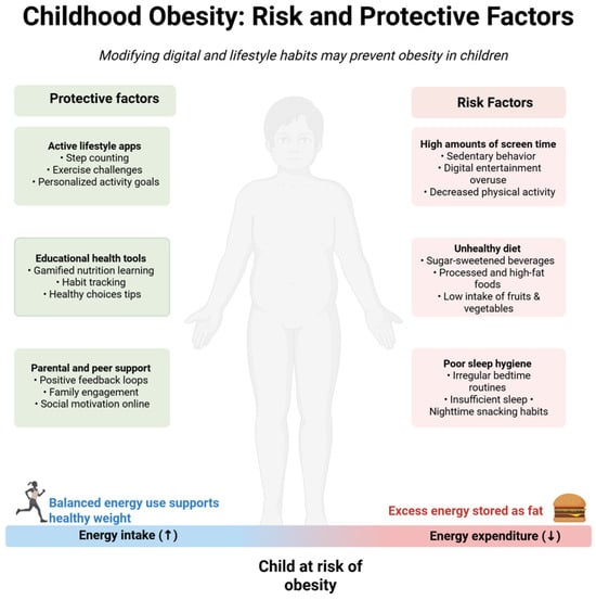 The prevalence of obesity continues to rise. The aetiology of obesity in children and adolescents is multifactorial and involves complex interactions between genetic, environmental, behavioural and psychosocial factors. Weight regulation shows considerable biological variability, with some individuals naturally maintaining healthy levels of body fat, while others strive to achieve energy balance throughout life. An important role in the development of obesity is played by the home environment, which shapes the occurrence of certain dietary patterns, such as a high-calorie diet, a lack of regular physical activity, disrupted sleep patterns, and excessive time spent in front of a screen [8]. Studies have shown that children from lower socio-economic backgrounds are significantly more likely to be overweight compared to peers from more affluent families [9]. Other important risk factors include maternal obesity before pregnancy, excessive weight gain during pregnancy and gestational diabetes [10]. Among the most common behaviours contributing to obesity is a high consumption of sugar-sweetened beverages and nutrient-poor foods high in saturated fat [11]. It is therefore important to implement modern digital technology solutions to minimise the risk of obesity by supporting healthy eating habits, promoting physical activity and raising health awareness among children and adolescents (Figure 1).