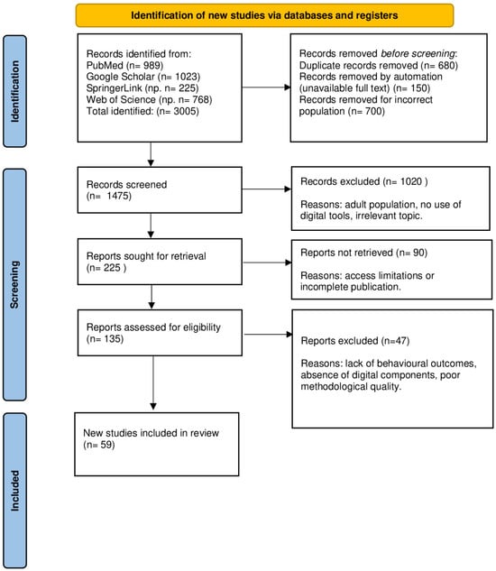 Four databases were searched: PubMed (n = 989), Google Scholar (n = 1023), Springer Link (n = 225) and Web of Science (n = 768). A total of 3005 publications were identified. Prior to the screening stage, 680 duplicates were removed, 150 publications were automatically rejected due to the lack of a full text, and 700 were excluded due to the inappropriateness of the study population (e.g., adult studies), or the lack of a digital component. A total of 1475 publications were shortlisted for the initial screening stage, of which 1020 were rejected after analysis of titles and abstracts. Subsequently, 225 publications were referred for full-text analysis, but 90 could not be retrieved due to limited access. The remaining 135 full-text articles were assessed for compliance with the inclusion criteria. After further analysis, 47 publications were excluded, mainly due to a lack of behavioural outcomes, a lack of digital technologies or poor methodological quality. Ultimately, 59 studies were included in the final review.