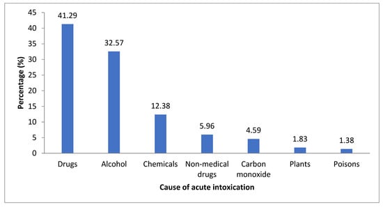 Drugs (medicaments) were the most common cause of intoxications (41.29%), followed by alcohol (32.57%), chemicals (12.38%), and non-medical drugs, such as marijuana, cocaine, and amphetamine (5.96%), as shown in Figure 1. Poisons (insecticides, rodenticides, and organophosphates) were the rarest cause of intoxications, as shown in Figure 1.
