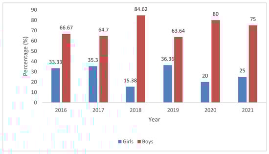 Gender distribution of children aged 0–18 years hospitalized for acute alcohol intoxications at Department of Pediatrics, University Hospital of Split from 1 January 2016 to 31 December 2021 by every observed year.