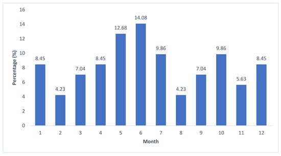 Children who became intoxicated with alcohol most often consumed it in June (N = 10; 14.08%) and May (N = 9; 12.68%) and less frequently consumed it in February (N = 3; 4.23%) and August (N = 3; 4.23%), as shown in Figure 3.