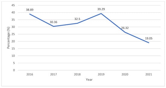 Hospitalizations for AAIs among children have changed over time, with some studies reporting an increasing trend [,,,,,,,,], and others a decreasing one [,,,]. Similar to those findings, a study provided at the Department of Pediatrics, University Hospital of Split found an alarming increasing trend of AAIs among children over the period from 1997 to 2007 []. On the other hand, another study at the same department found a significant deceasing trend from 2008 to 2015, predicting a further annual decline of 10.10% []. The aim of our study was to explore if the predicted declining trend really continued from 2016 to 2021, or some changes had happened, with our special attention given to a period of the COVID-19 pandemic in the year 2020.