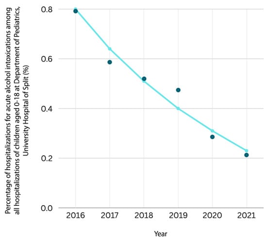 The University Hospital of Split is the clinical hospital center to which all population of Split-Dalmatia County (SDC) and even some surrounding areas gravitate. In year 2021, there were about 423 407 inhabitants in SDC []. Bitunjac and Saraga found an alarming increasing trend of hospitalizations for AAIs among children hospitalized at the Department of Pediatrics, University Hospital of Split, from 0.30% in 1997 to 1.70% in 2007 []. Another study at the same department showed a declining trend in the following years, from 1.33% in 2008 to 0.75% in 2015, predicting an annual decline of 10.10% in every following year []. The results of our study confirmed a continuing declining trend, showing a decrease in hospitalizations for AAIs from 0.80% in 2016 to 0.23% in 2021. Based on these results, a further predicted annual decline in AAIs among all hospitalizations is 21.26% per year, which is even higher than the previous study predicted []. The declining trend could be a result of a more pronounced awareness in society about the problems of alcohol consumption among children and adolescents, which influenced the development of better educational or preventive measures in recent years. The living conditions have improved in recent years, and parents and children probably have better knowledge about the negative impact of alcohol consumption on children’s health than before. Drinking habits could also be changed, and it is possible that adolescents still consume alcohol while socializing with their friends, but in smaller quantities that do not lead to AAIs. On the other hand, it could also be possible that some changes in social behaviors among children and adolescents have happened and that drinking alcohol has become less popular than engaging in some other risky behaviors (e.g., e-cigarettes smoking, consuming new drugs, filming risky videos and posting them to social media, etc.).