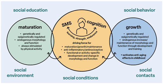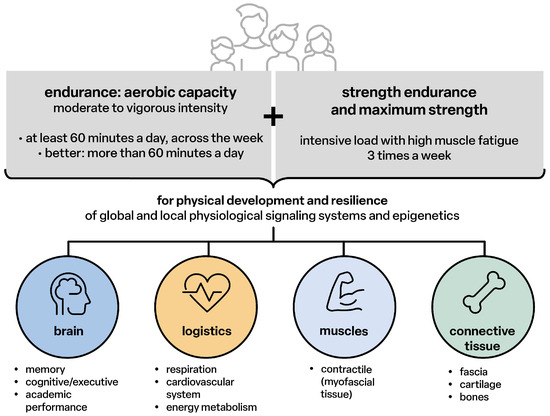 Structurally effective physical activities for movement skills (sensorimotor coordination), endurance and strength are the essential driving forces for sensorimotor and cognitive-emotional and social development, maturation, the anti-inflammatory status of all tissues and organs, healthy growth and the reduction of the risk of developing primary chronic degenerative diseases in every age group (Figure 2).