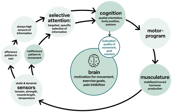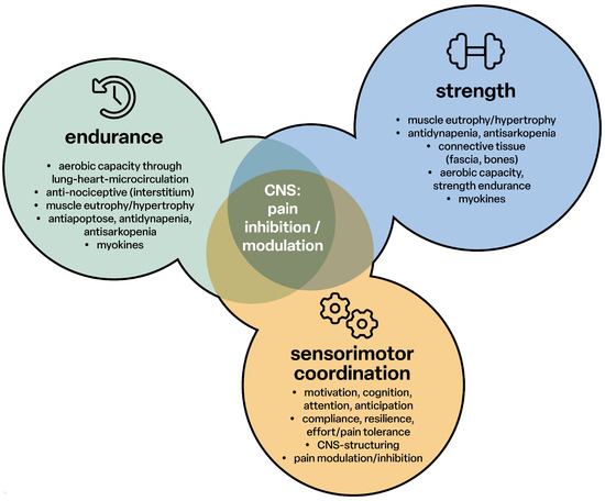 Endurance, strength training and sensorimotor coordination support pain inhibition and modulation in the central nervous system. The cerebral functions are supported via the myokines to develop and promote memory function and train resistance to exertion and pain (Figure 3).