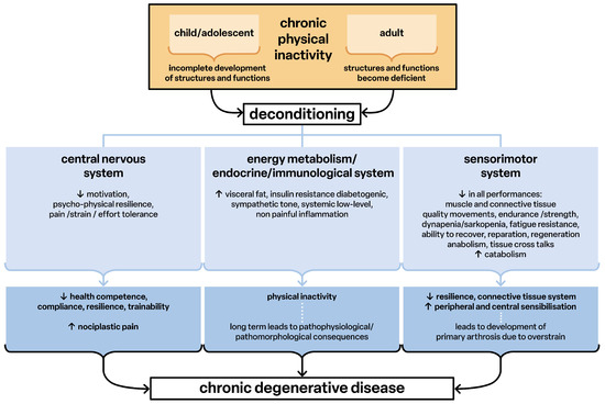 In deconditioning, all functions of the sensorimotor system are impaired. The communication of the tissues via their signaling substances and genetic information (exosomes) [17,18,19] promotes the mutual pathophysiological structuring and thus the further development of diseases (Figure 4). The overall result is the development of nociplastic pain syndromes [20,21,22] in which the reported pain can no longer be explained by peripheral findings of tissue damage or inflammation [23]. Thus, pathophysiological developmental processes may occur in primarily structurally and functionally healthy people because of chronic physical inactivity.