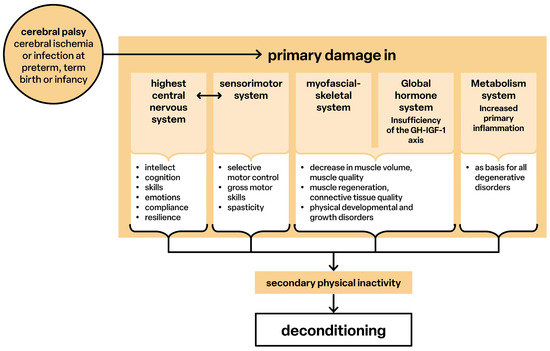 Figure 6 provides an overview of the pathological processes in CP. An inadequate blood supply causes primary structural disturbances, the timing and extent of which determine development. Damage to the structures of the somatosensory and corticomotor networks [39] and their interactions leads to loss of selective motor and postural control [71,72] and causes spasticity. Sensorimotor disorders include intellectual, cognitive, emotional functions and communicative behavior [73,74]. Pathological cerebral connectivity also causes deficits in the hypothalamus–pituitary–liver axis (GH–IGF-1; not considered in detail), resulting in growth disorders [75,76]. Muscle mass is qualitatively and quantitatively restricted, and the ability to regenerate is reduced [8,61,62]. Generalized inflammatory processes also occur, and sarcopenia develops at an early stage [13,77,78]. The sensorimotor limitations cause secondary physical inactivity, whereby the already functionally underdeveloped structures develop an ‘extended’ deconditioning.