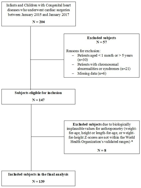 Patients with chromosomal abnormalities or syndromes including Trisomy 21 and DiGeorge syndrome were excluded due to the potential confounding effect of these conditions on nutritional status. In addition, patients with biologically implausible values (BIVs) for anthropometry or missing postoperative data were excluded from the analysis (Figure 1).