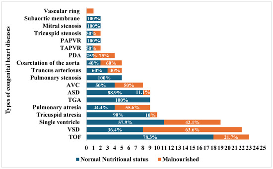 The most common CHDs in our study were VSD (n = 23) and tetralogy of Fallot (TOF) (n = 22), followed by single ventricle (n = 19) and tricuspid atresia (n = 10). (Figure 2). The association between malnutrition and the most common types of CHDs was performed, showing that the odds of being malnourished among subjects with VSD were 6.3 times (95% CI: 1.7–23.5) greater than in those with TOF and 15.8 times (95% CI: 1.7–148.1) greater than in those with tricuspid atresia (p-values: 0.006 and 0.016, respectively). Compared to children with normal nutritional status, children aged younger than 24 months had 4.4 times higher odds (95% CI: 1.8–10.8) of being malnourished than those 24 months or older.