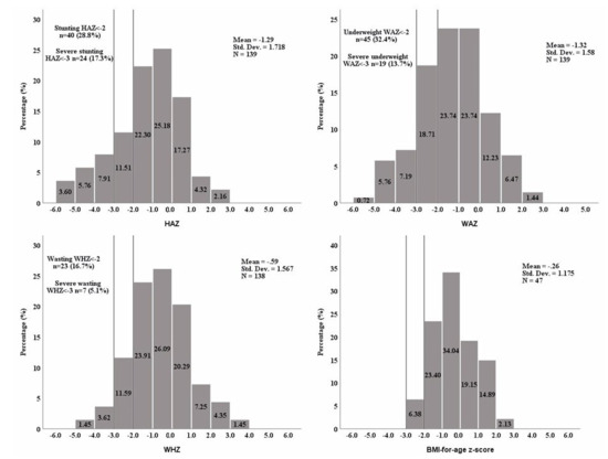 The distribution of anthropometric z-scores. HAZ: height-for-age z-score, WAZ: weight-for-age z-score, WHZ: weight-for-height z-score, BMI: body mass index (calculated only for children ≥24 months old). WHZ could not be calculated for one patient as weight-for-height charts are available only for heights between 77 and 121.5 cm.
